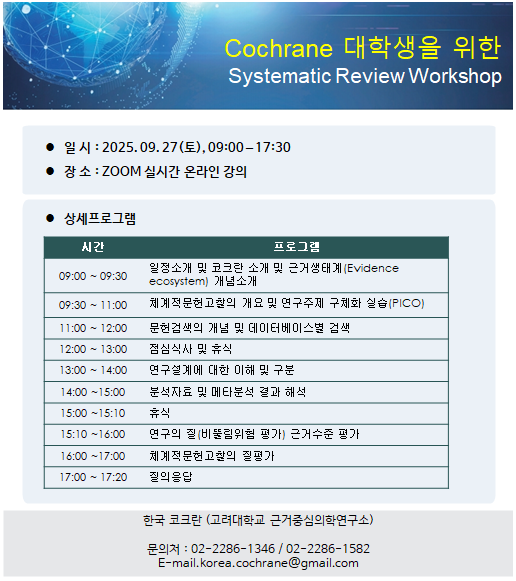 한국 코크란에서 주최하는 "체계적 문헌고찰 워크샵"을 안내드립니다.